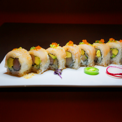 Karai Hamachi Yellowtail, cilantro, jalapeño, garlic chip with carpaccio sauce.